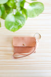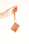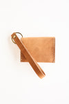 Features a brass closure, a leather wristlet for carrying and 3 interior card slots.