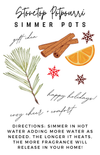 *Directions: Add spices to hot water & simmer on stovetop. We use high quality dried spices for a potent blend. While simmering they will release a wonderful fragrance. The spices and water blend can be stored in the refrigerator between uses for multiple simmers.