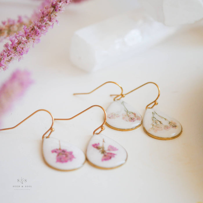 These small dangle earrings are delicate and lightweight, adorned with dark pink botanicals set against a white background.